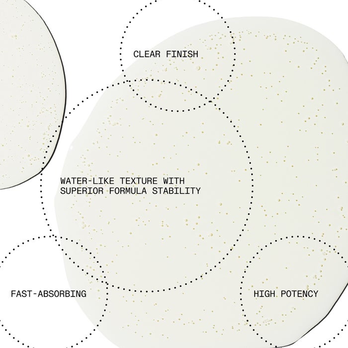 Its waterless base ensures that this formula stays clear and potent. Due to its unique waterless nature, it may feel 'oily' for a few seconds to some. However, it is oil-free, and the oily feeling will dissipate quickly as the serum absorbs into the skin.